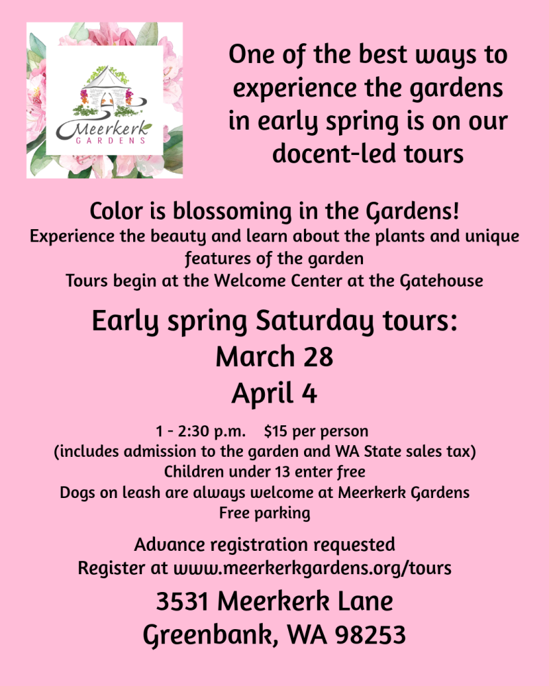 Spring Boom is happening! One of the best ways to experience Meerkerk Gardens is on a docent-led tour. Experience the beauty and learn about the plants and unique features of the garden. Tours being at the welcome center at the Gatehouse.