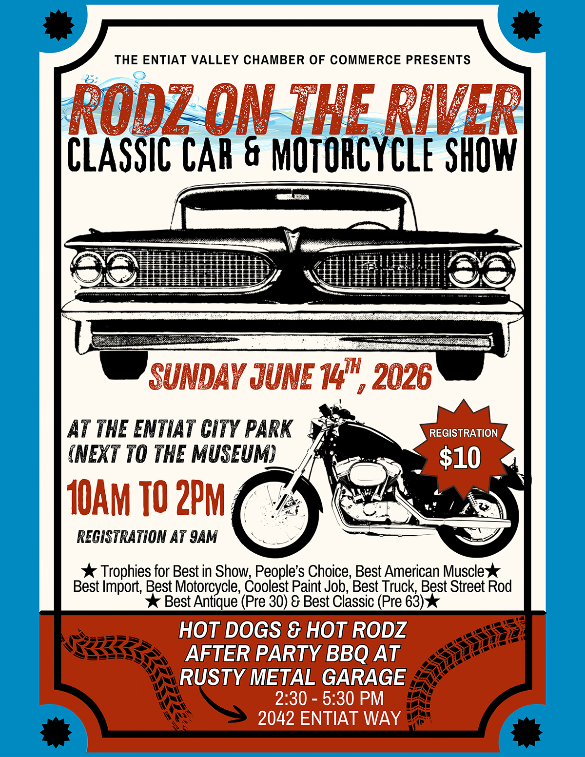 Join us for a day of hydros, classic cars, and bikes. Watch the hydros and vote on your favorite classic car or motorcycle. Car show after-party (Hot Dogs and Hot Rodz) happening afterwards.